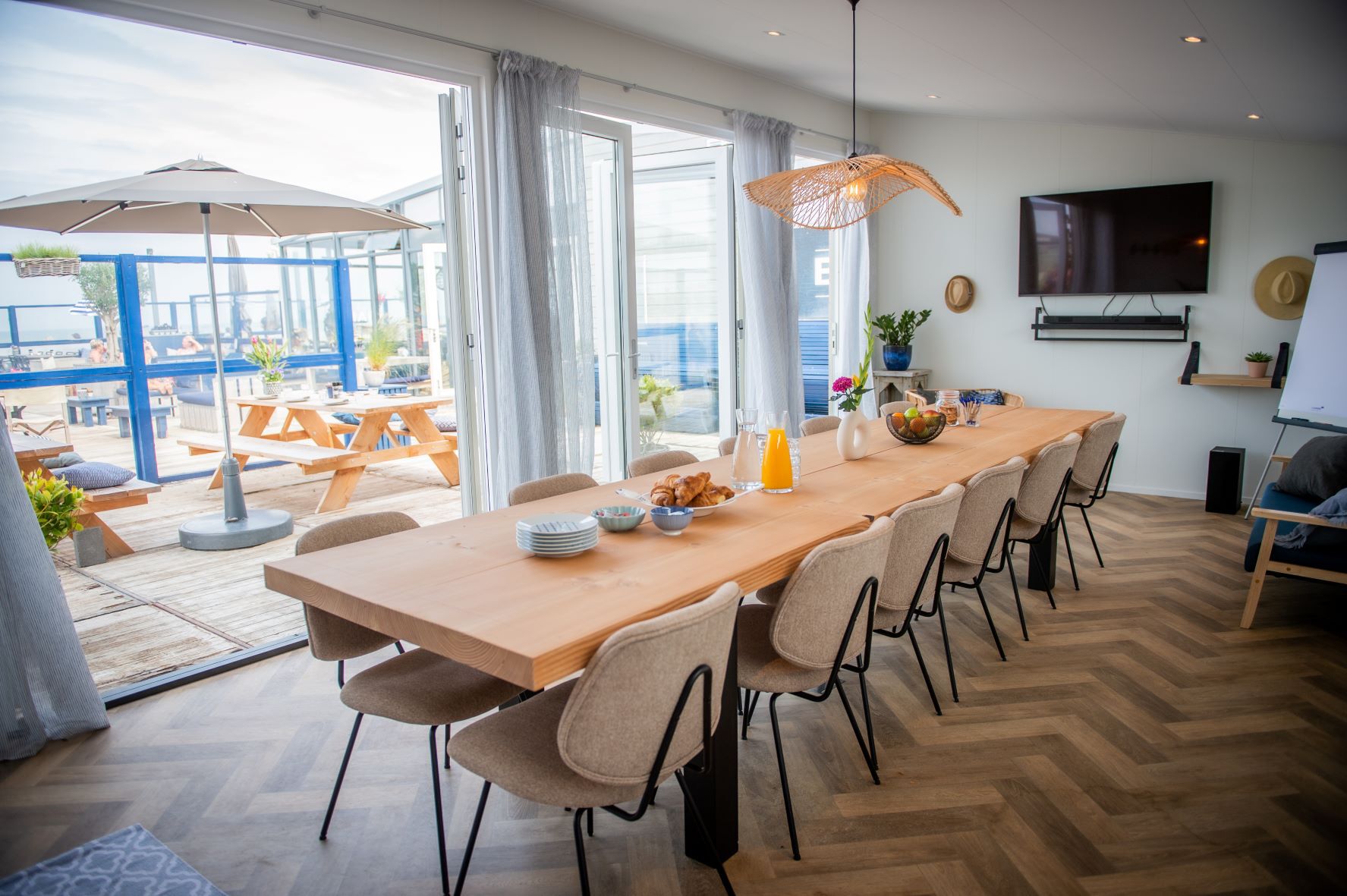 Vergaderen aan zee. Met twee verschillende ruimtes is er altijd een fijne plek voor een meeting, training of zakelijk event. Voor gezelschappen van 6 tot en met 12 personen is de exclusieve BAIT meeting room beschikbaar. Stijlvol ingericht, voorzien van alle gemakken, airconditioning en een eigen terras. In de ruim opgezette serre kan in alle rust worden vergaderd of presentaties worden gegeven voor grotere gezelschappen van 13 tot 40 personen. Een inspirerende omgeving, een ruim privéterras, en zicht op het strand en de zee zorgen voor een vruchtbare meeting. De sfeervolle inrichting en heerlijke, uitgebreide lunch en/of diner doen de rest. Ook leuk in combinatie met een sportieve activiteit of bijvoorbeeld een bezoek aan museum Voorlinden. Korter of langer vergaderen, kleiner gezelschap of een andere invulling? Maatwerk is mogelijk.