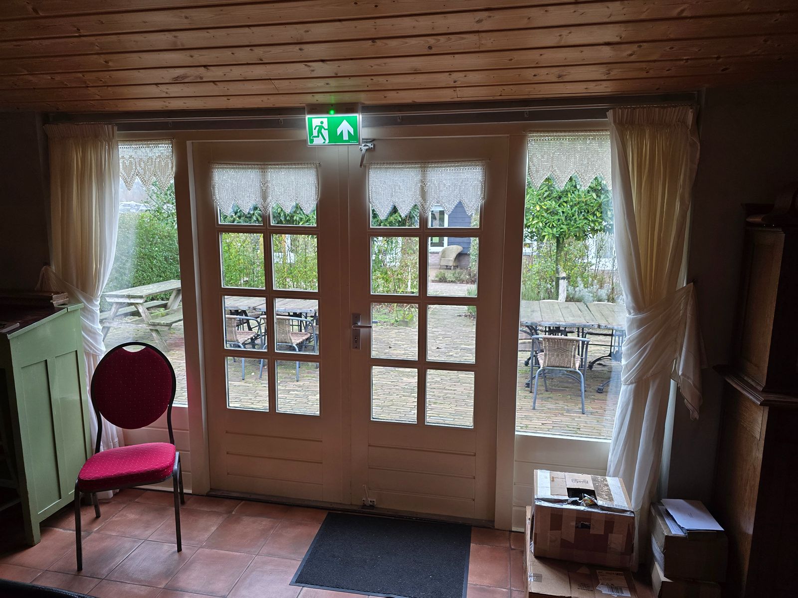 De inrichting van de zaal is huiselijk. Als u van deze sfeer houdt, dan bent u op het juiste adres. Alles ademt de sfeer van vroeger thuis, gecombineerd met een bar en een zithoek. Klanten ervaren dit als rustgevend en huiselijk. De openslaande deuren brengen u naar het heerlijke buitenterras, waar u in de zomerdagen lekker buiten kunt lunchen of vergaderen.