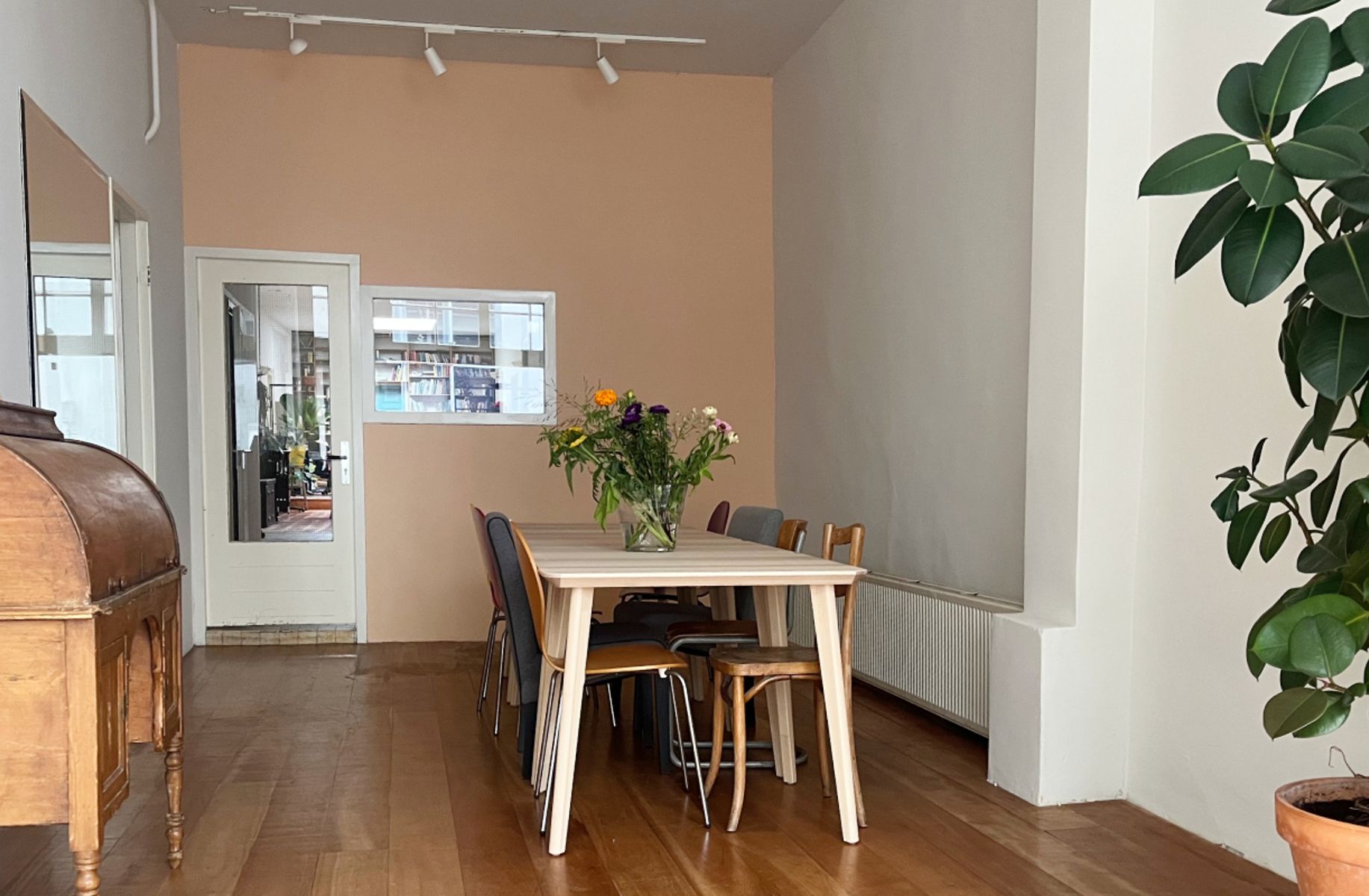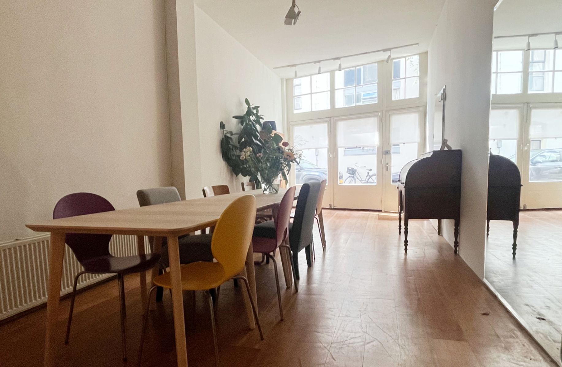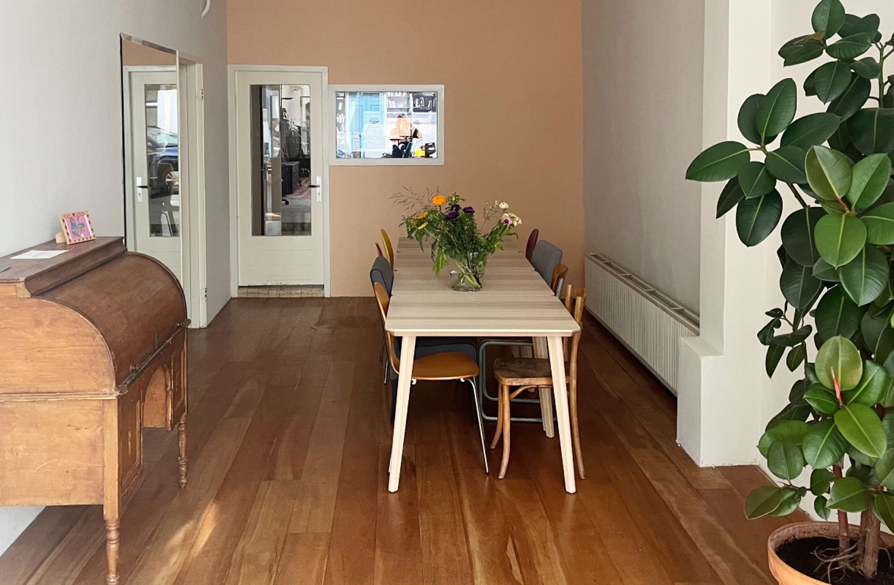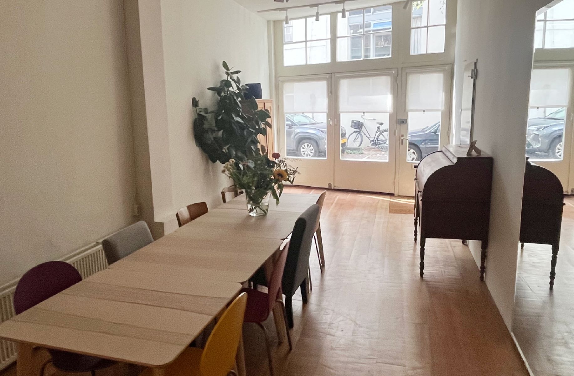 Rustige werk- of ontmoetingsruimte in het centrum van Amsterdam. Deze unieke ruimte is een fijne plek om een dag(deel) te vergaderen of te werken. De ruimte is 35 vierkante meter groot en geschikt voor 1 tot 12 personen. Er is veel daglicht via de glazen wand die uitkijkt op een zeer rustig Amsterdams straatje. Vitrages zijn aanwezig voor extra privacy. Daarnaast is er een inloopkast om jassen en spullen op te bergen. De wc en keuken, met koelkast en gratis koffie en thee, bevinden zich aansluitend aan de te huren ruimte. De ruimte wordt beheerd door de filmorganisaties GROM Producties en De Ontmoeting. Belangrijk om te weten is dat er zeer incidenteel iemand door de ruimte moet, omdat de voordeur gedeeld wordt met het kantoor van GROM en De Ontmoeting.