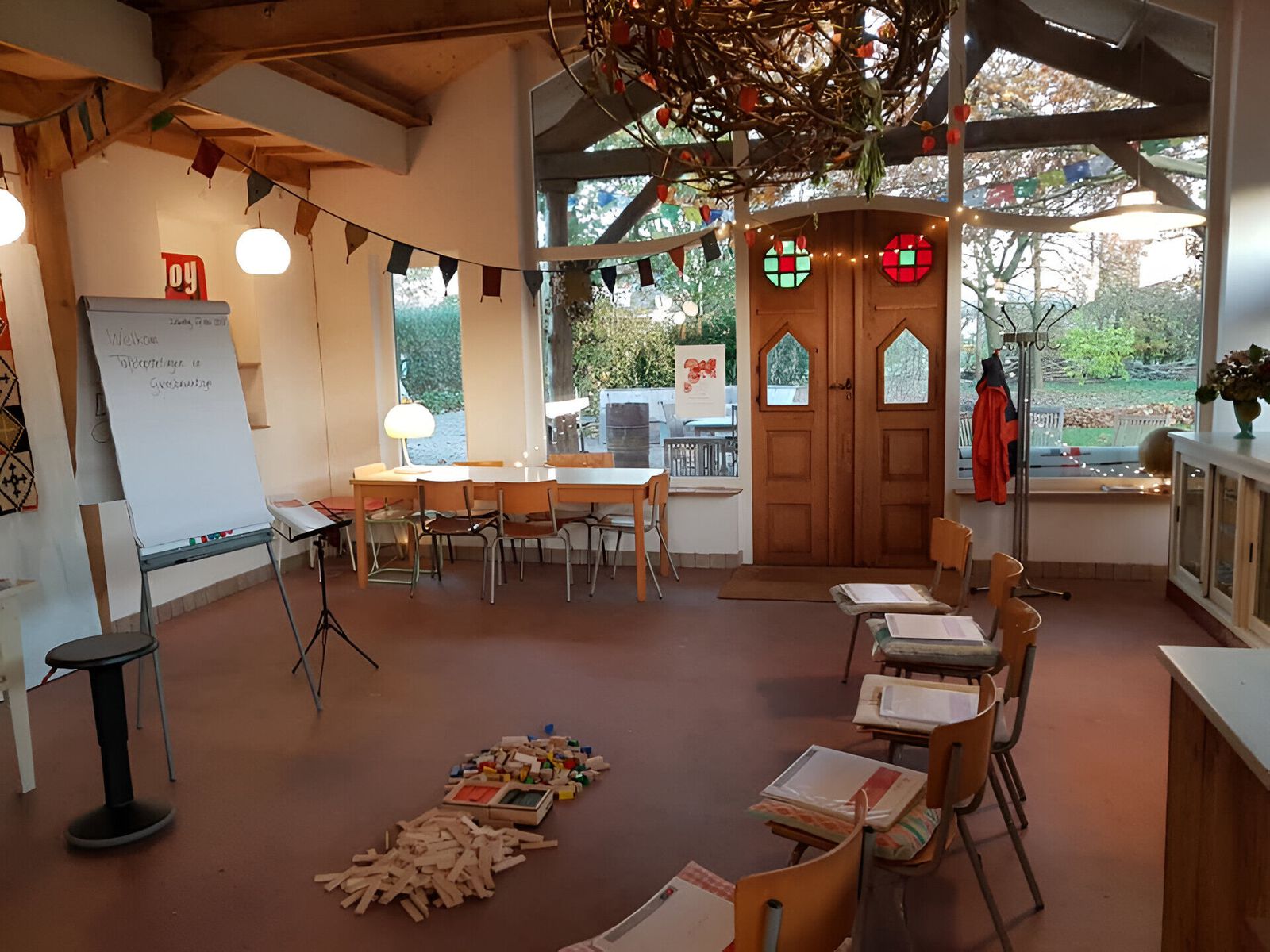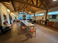 De vergaderruimte biedt een warme en inspirerende omgeving die perfect is voor teams die op zoek zijn naar een creatieve en rustgevende setting. De ruimte heeft een huiselijke en comfortabele sfeer, waarbij natuurlijke materialen en zachte verlichting bijdragen aan een gevoel van welzijn en concentratie. De ruimte is omringd door een boomgaard vol fruitbomen, wat bijdraagt aan de serene uitstraling. Met flexibele opstellingen kan de ruimte gemakkelijk worden aangepast aan verschillende soorten bijeenkomsten, workshops of brainstormsessies.