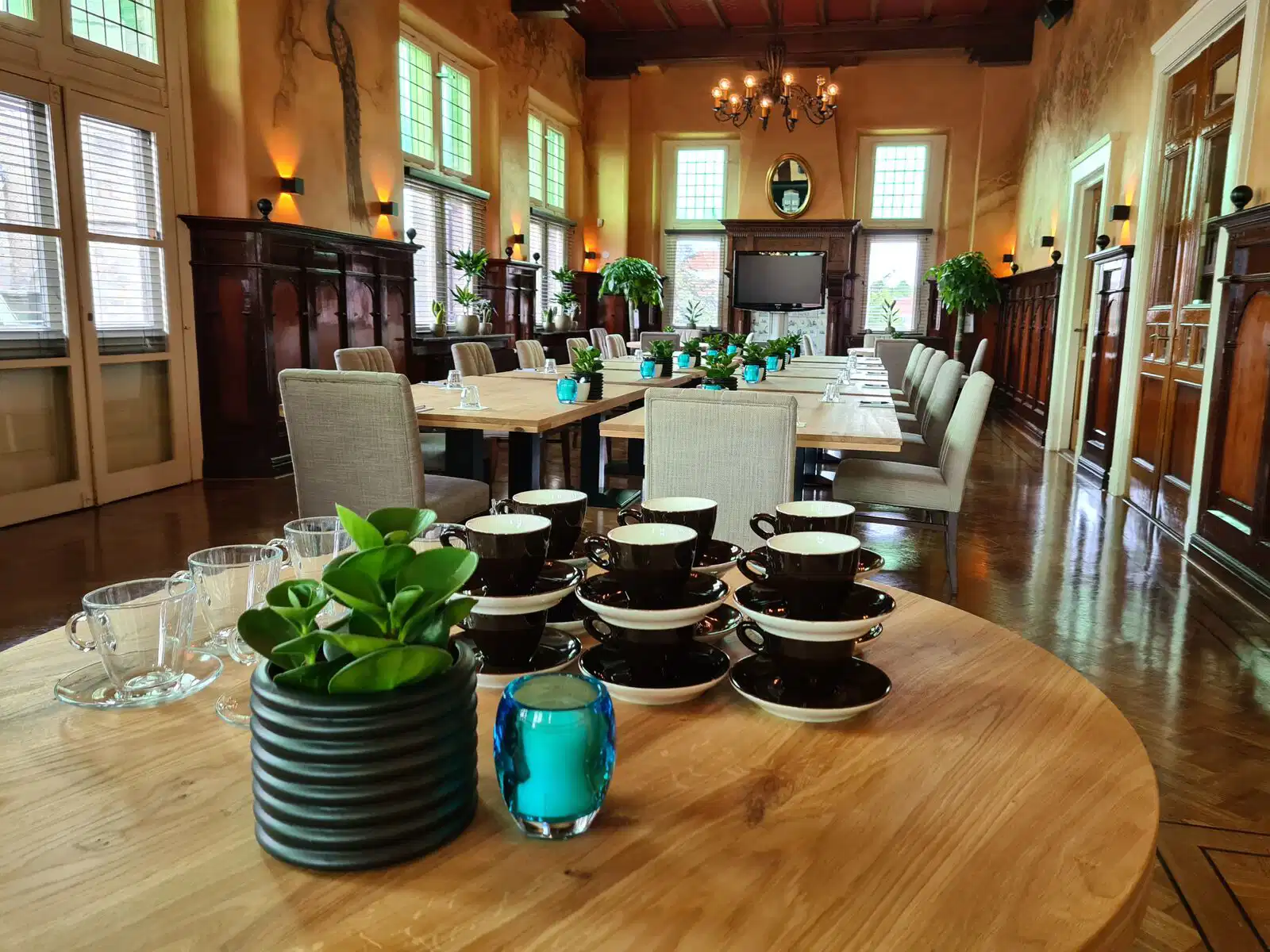 Vergaderlocatie De Wethouder heeft enerzijds vergaderruimtes die het nostalgische karakter van het gemeentehuis uitstralen en anderzijds een bijzondere verbouwde industriële en moderne benedenverdieping.