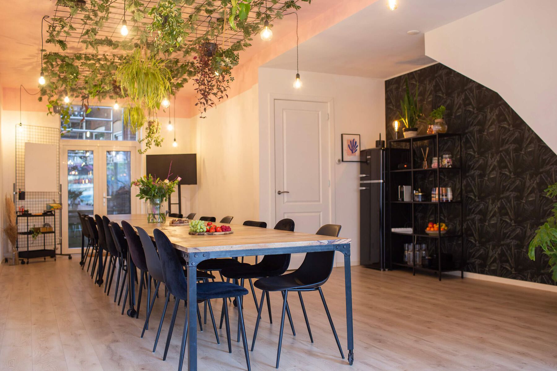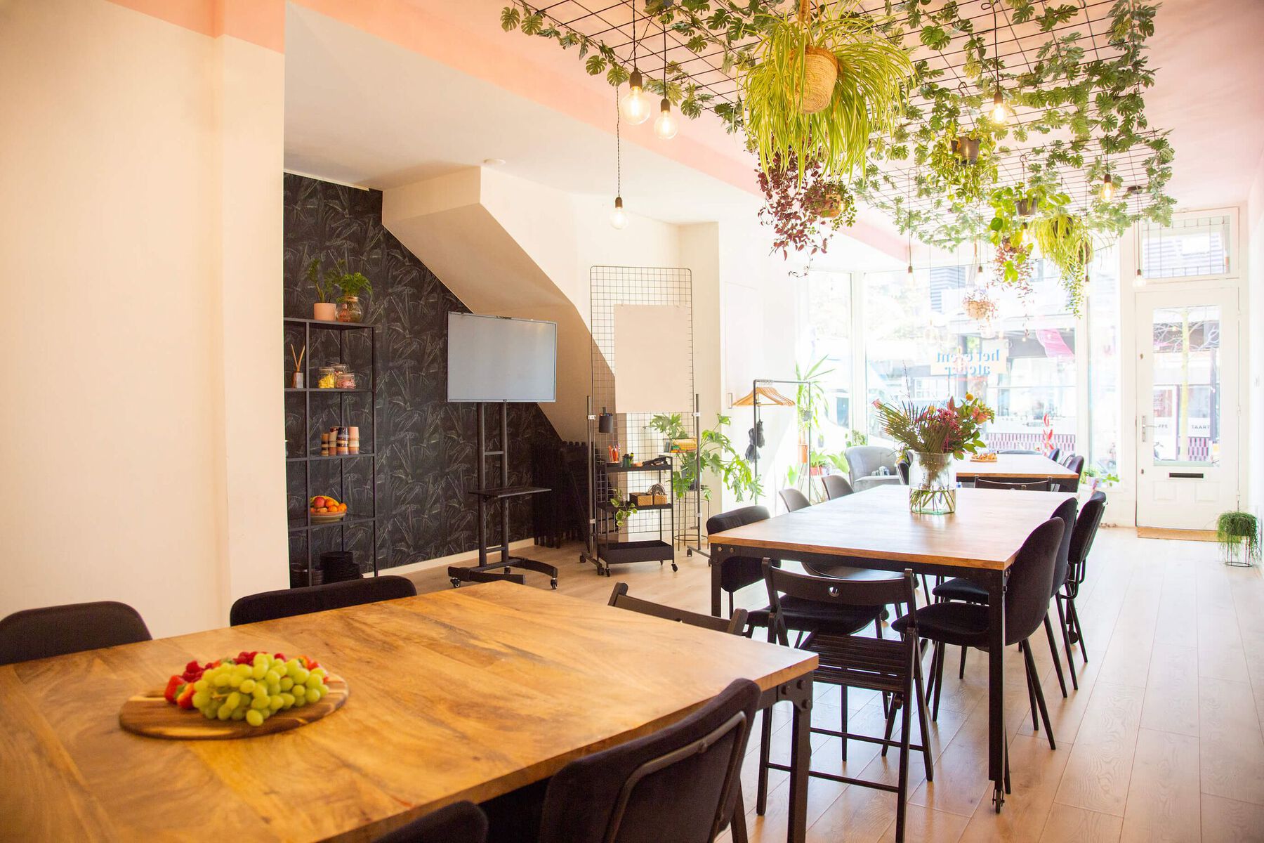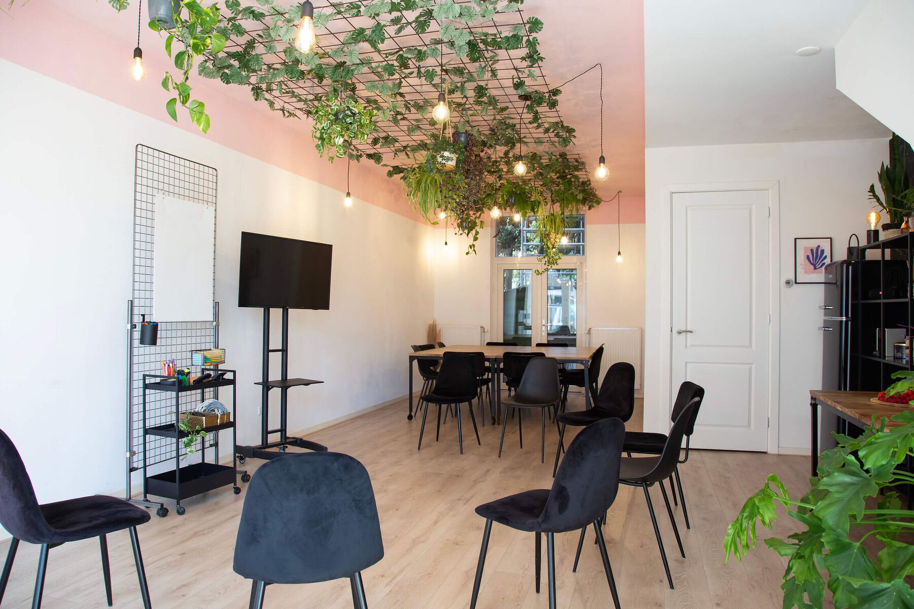 In een prachtig oud winkelpand op de begane grond. Sfeervol, licht en flexibel om in te richten naar jouw eventwensen. Comfortabele stoelen en een Edgy Roze Urban Jungle-plafond maken deze locatie helemaal af.