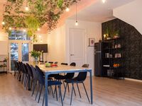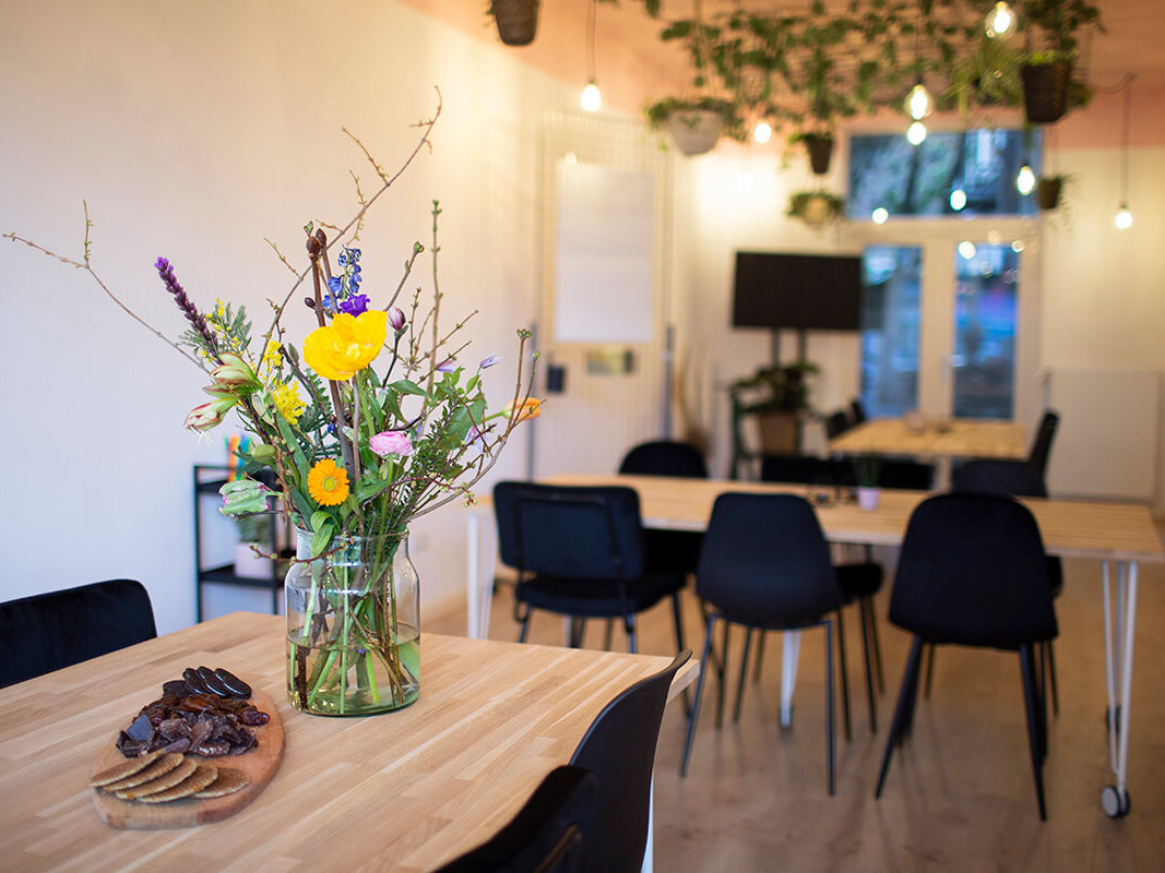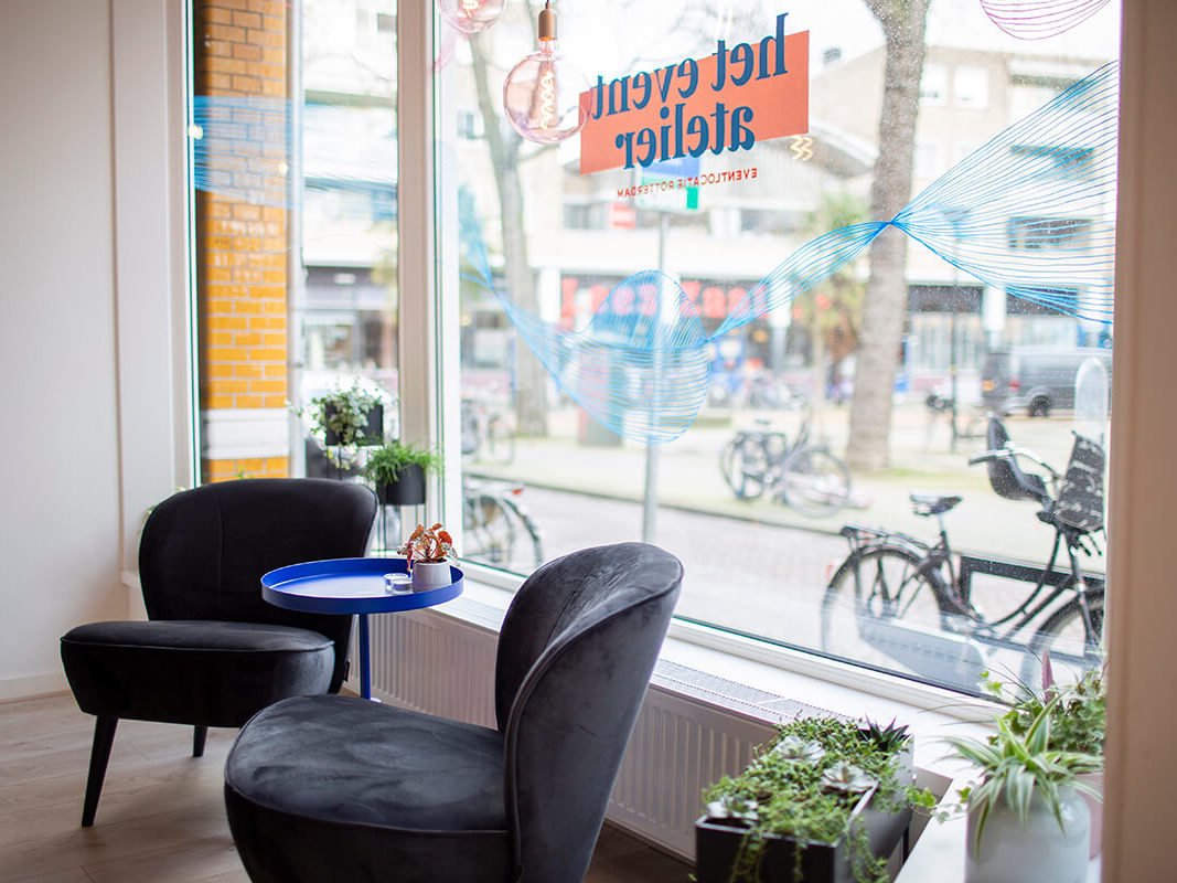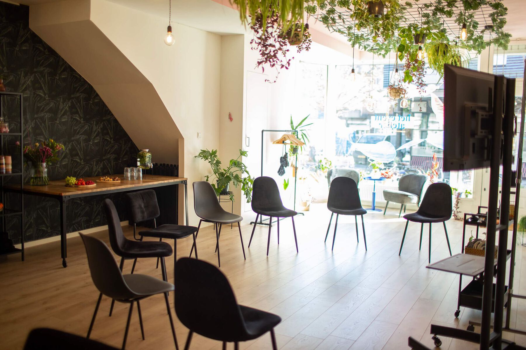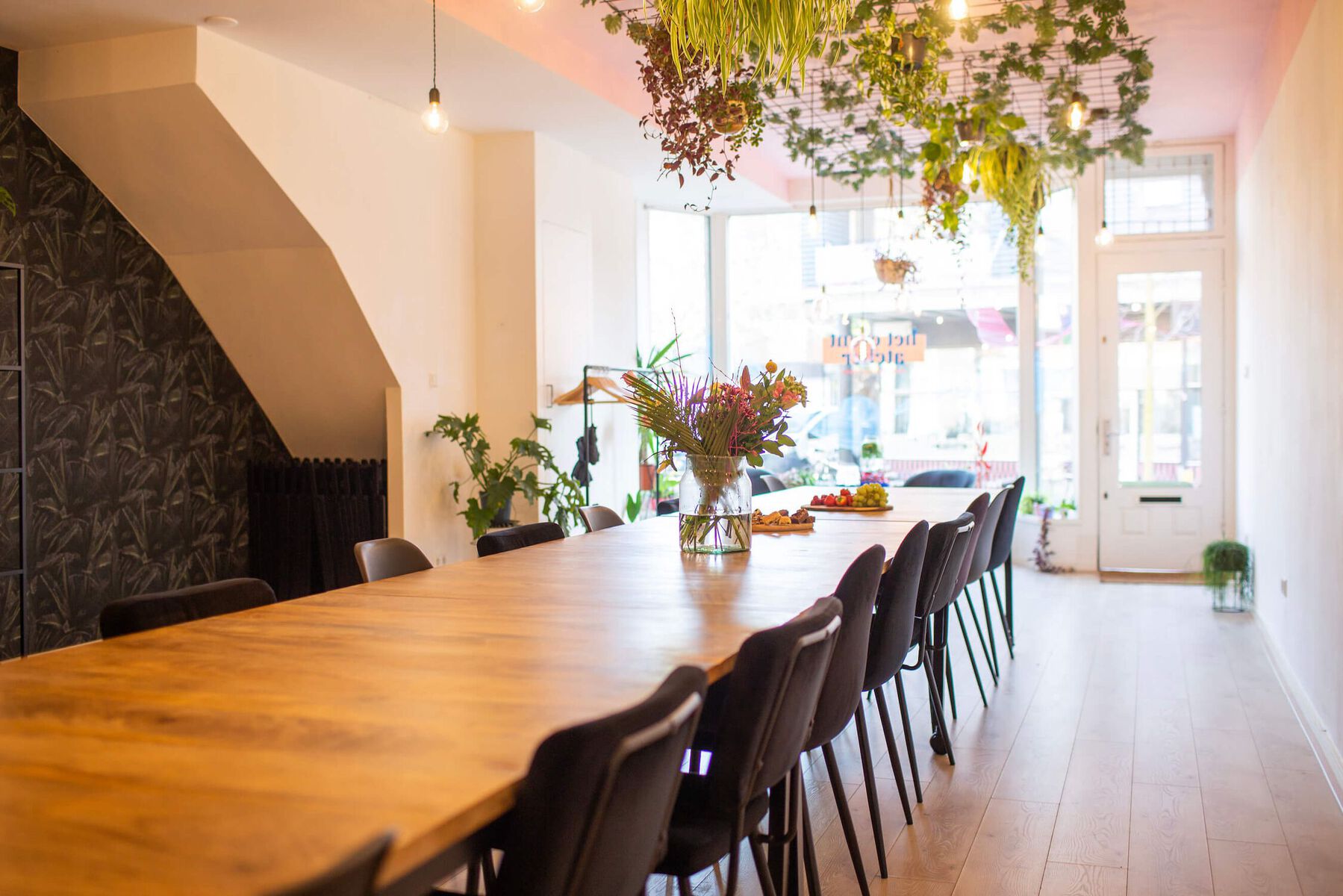 In een prachtig oud winkelpand op de begane grond. Sfeervol, licht en flexibel om in te richten naar jouw eventwensen. Comfortabele stoelen en een Edgy Roze Urban Jungle-plafond maken deze locatie helemaal af.