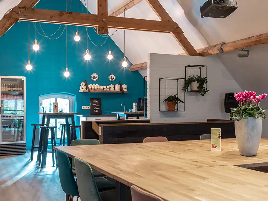 De hoofdruimte bevindt zich op de 1e verdieping. De ruimte heeft een landelijke uitstraling dankzij de grote houten balken. H…