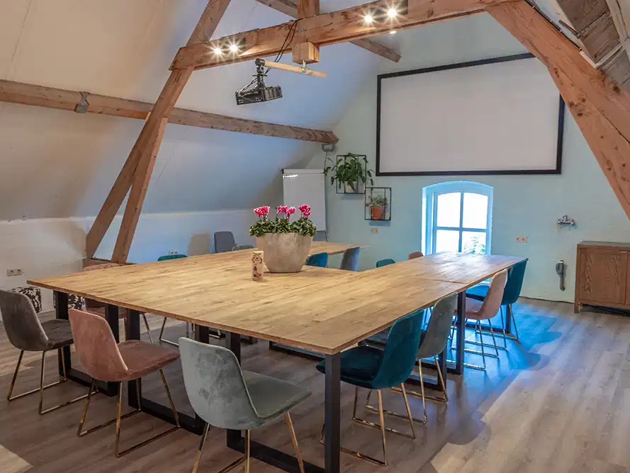 Er zijn geen speciale vergaderarrangementen. Er worden liever alle benodigde basiszaken aangeboden in de heldere huurprijs. Alles is inbegrepen behalve de lunch, borrel, frisdranken, vruchtensappen, energierepen en overige op maat wensen.