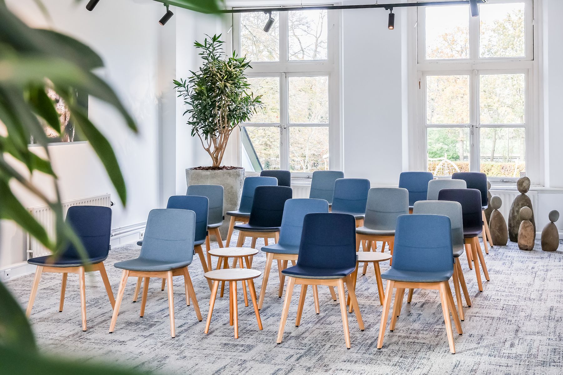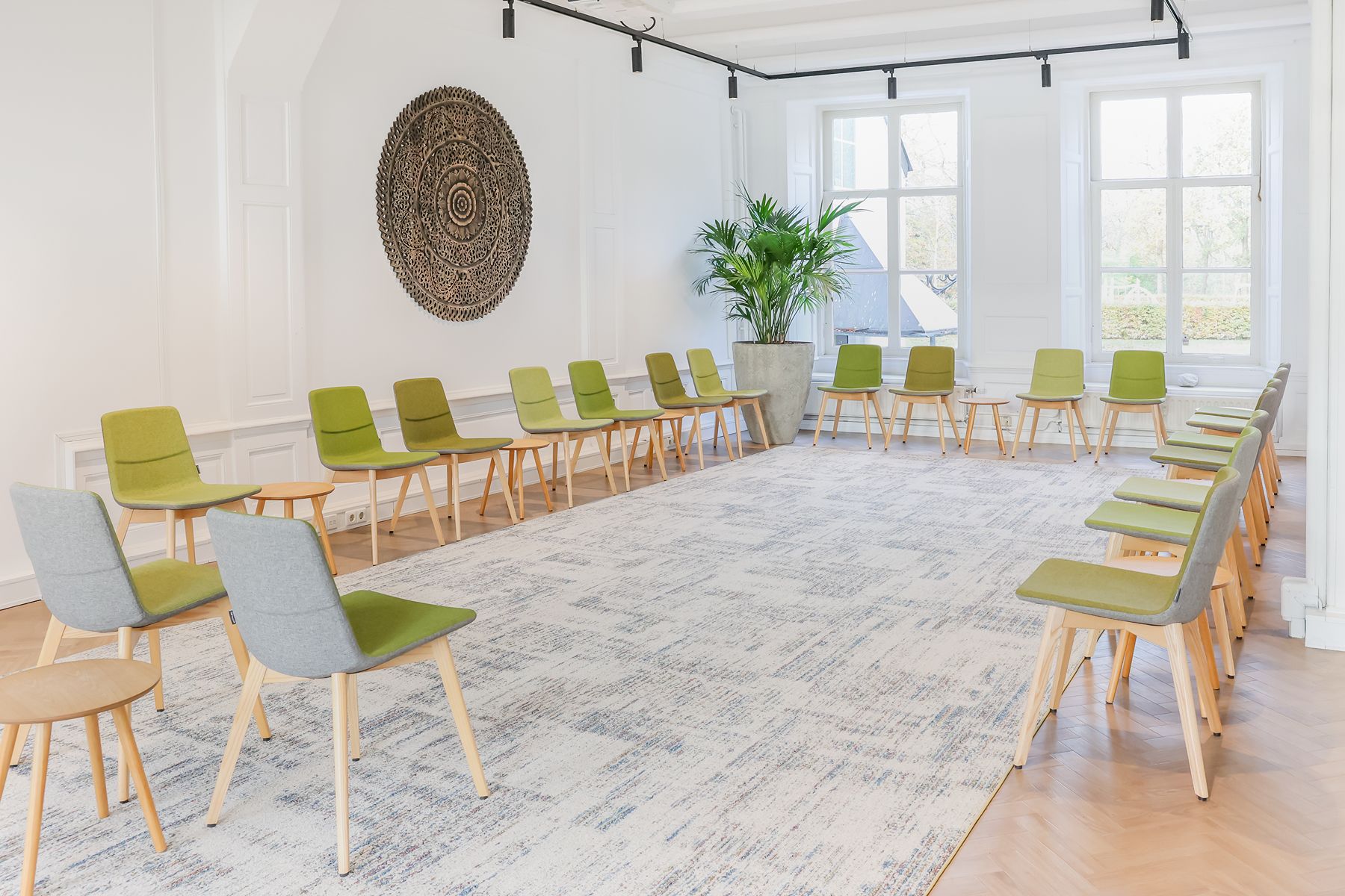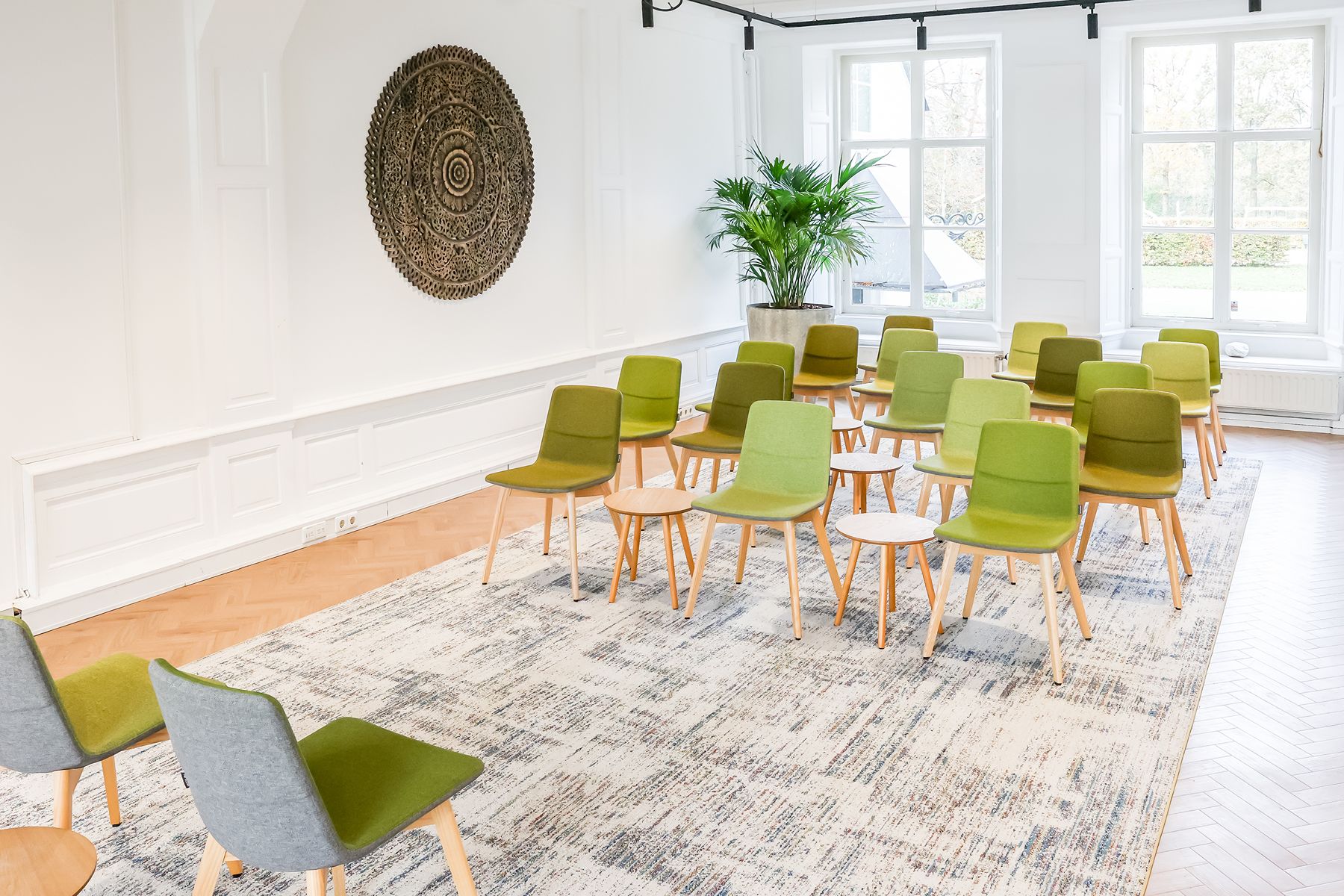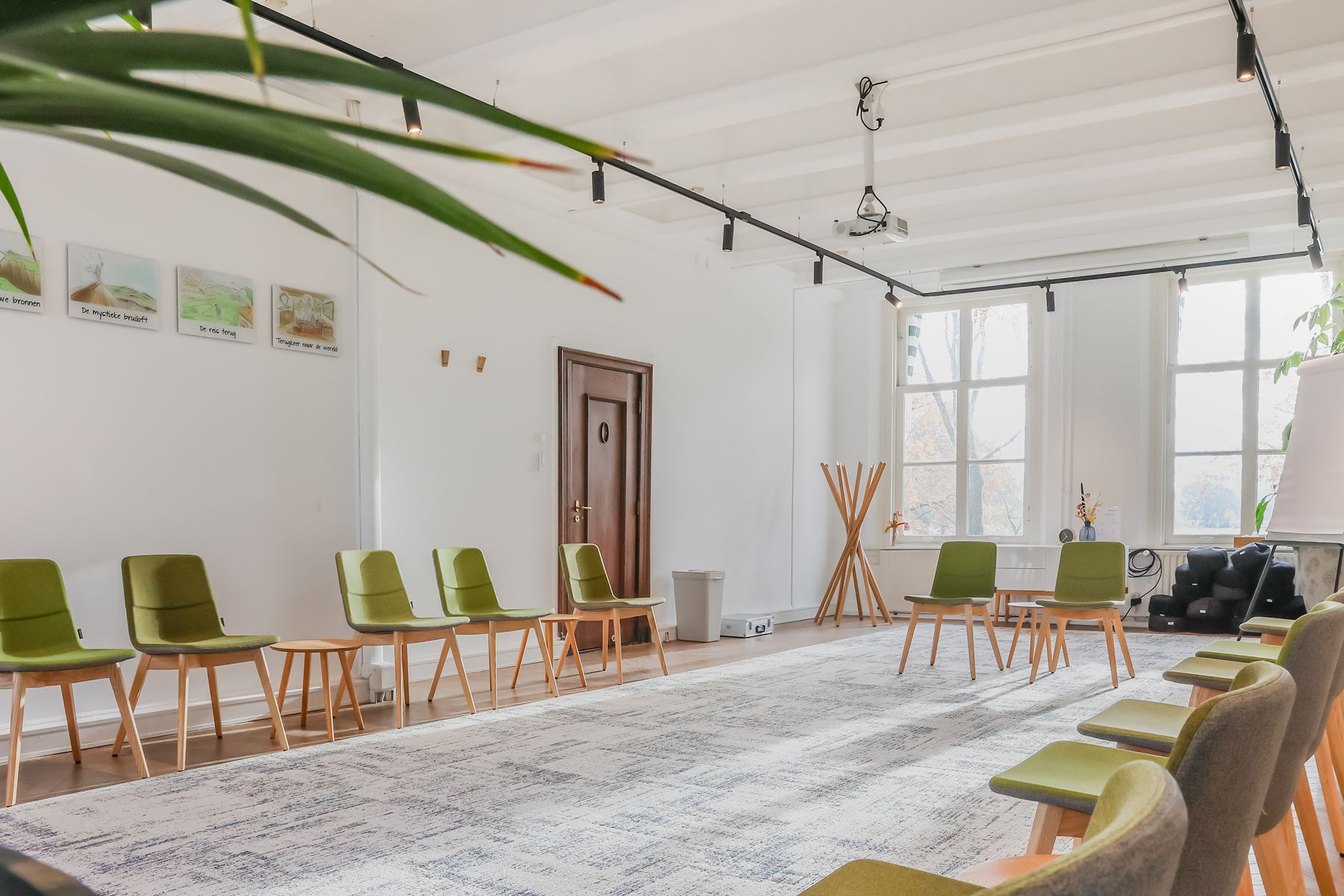 Inspiring Meetings biedt een doordacht ingerichte ruimte met veel daglicht, houten accenten en comfortabele designstoelen. Dit zorgt voor een harmonieuze mix van huiselijkheid en professionaliteit. De sfeer is kalm, inspirerend en vooral groen, letterlijk en figuurlijk. Elke ruimte kijkt uit op de beboste natuur van landgoed Marlot, waardoor je je direct verbonden voelt met de omgeving. Natuur is dan ook het overkoepelende thema bij Inspiring Meetings. De namen van de ruimtes zijn geïnspireerd op traditionele Indianennamen, een eerbetoon aan volkeren die bekendstaan om hun diepe verbondenheid met de natuur en hun respectvolle manier van samenleven met de aarde. Die spirit voel je hier overal terug. Het is de perfecte locatie voor trainingen, heisessies, workshops en teambuildingactiviteiten. Daarnaast bieden wij kleinere ruimtes aan voor bijvoorbeeld vergaderingen, brown paper-sessies en één-op-één coaching.