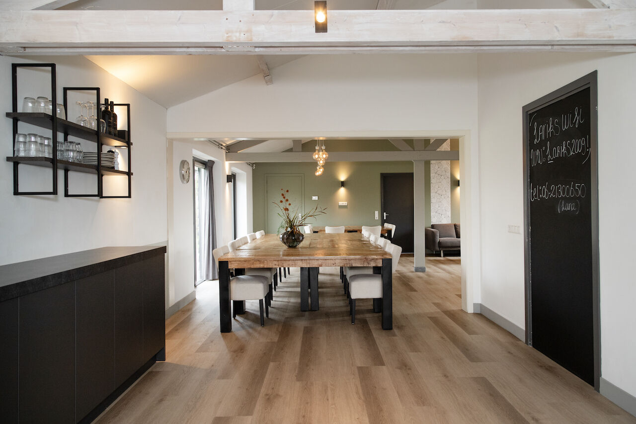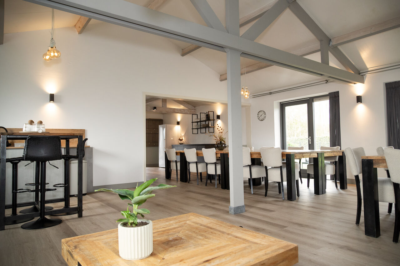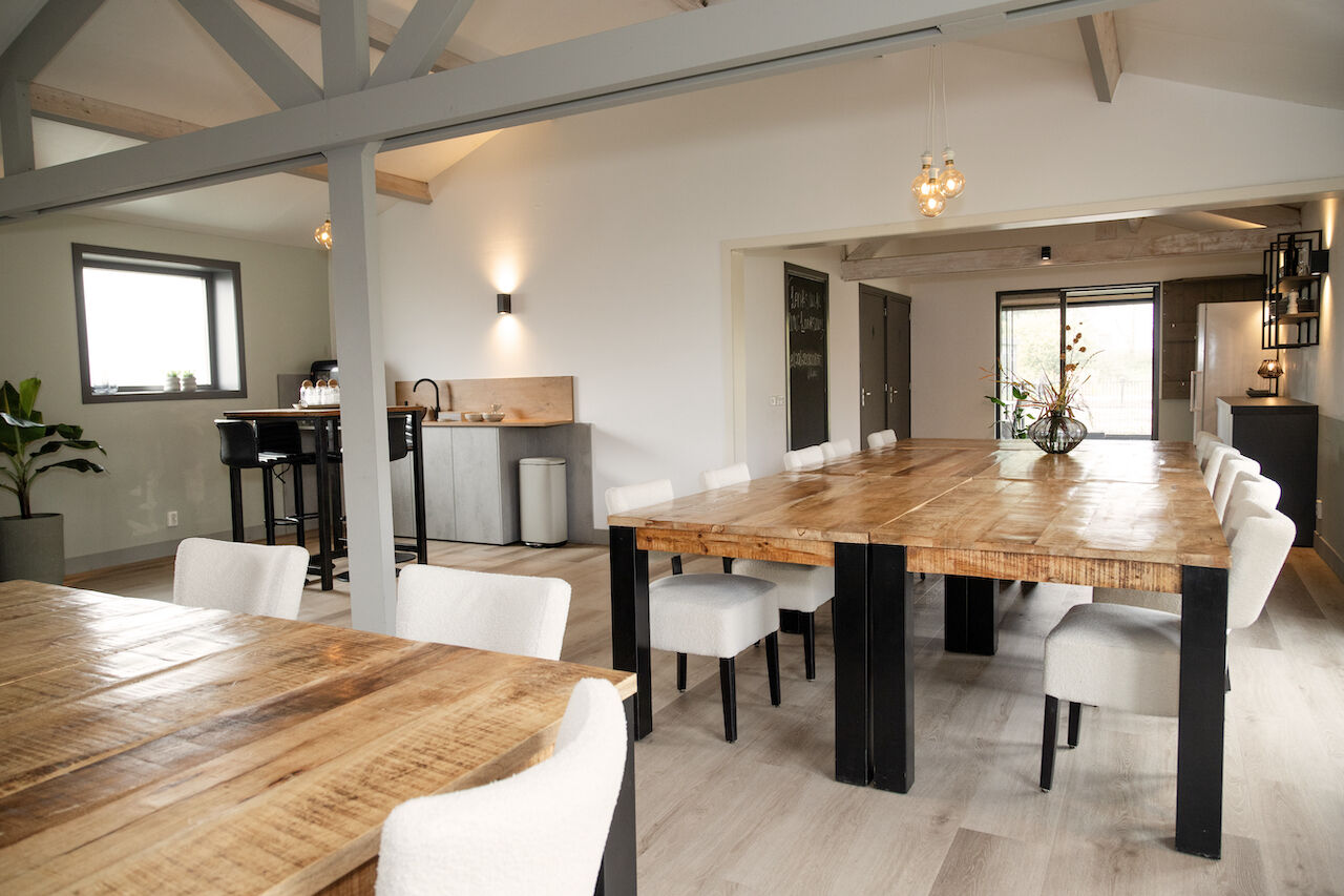 De Larik's Hoeve biedt een landelijke en rustige omgeving die uitnodigt tot ontspanning en inspiratie. De lichte, moderne ruimtes stralen warmte en gezelligheid uit, met een inrichting die perfect in balans is tussen stijl en comfort. Kies voor een comfortabele stoel aan tafel tijdens vergaderingen of geniet van de informele setting op de knusse banken. Buiten wacht een prachtige tuin die rust en ruimte biedt, ideaal voor een korte pauze of creatieve brainstormsessie in de natuur. Dankzij het prachtige uitzicht en de zorgvuldig ingerichte ruimtes voelt iedereen zich hier meteen thuis. Hier wordt een productieve dag gecombineerd met een ontspannen, aangename omgeving.