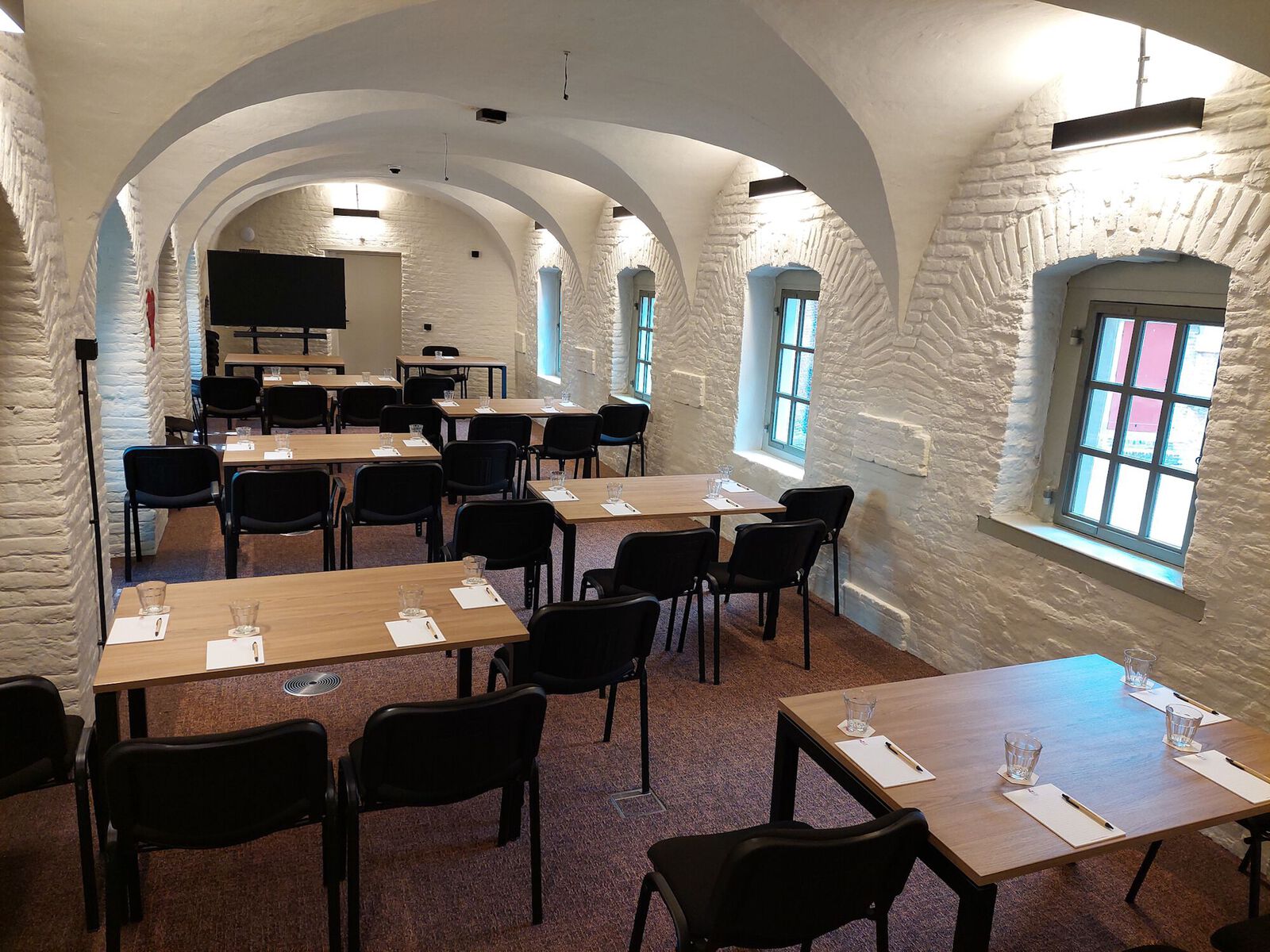 De vergaderzalen van Museum Kruithuis nemen je mee terug in de tijd, maar wel met de gemakken van nu. Maak gebruik van gratis high speed draadloos internet, klimaatbeheersing, een beamer, een projectiescherm, enzovoort en geniet ondertussen van een prachtig gewelfd plafond, authentieke houten balken en/of het adembenemende uitzicht op de binnenplaats. Ook in het Grand Café kijk je je ogen uit, door de hoge bogen en mooie lichtinval. Tijdens de restauratie is er op gelet het pand in ere te herstellen. Je ziet dus overal authentieke elementen. Ze zijn zelfs zo ver gegaan dat dingen die niet hersteld konden worden, toch hergebruikt zijn. Zo zijn de oude leien van het dak verwerkt bij de entree als wandbekleding en komt de oude vloer terug in het eiland bij Grand Café 1629. Museum Kruithuis biedt hiermee met de vergaderzalen een unieke locatie, waarbij je echt even uit het kantoorleven stapt en met een frisse houding een vergadering in kan.