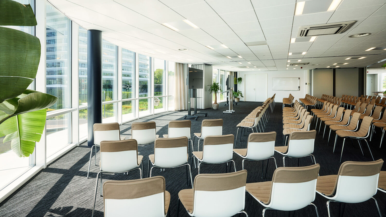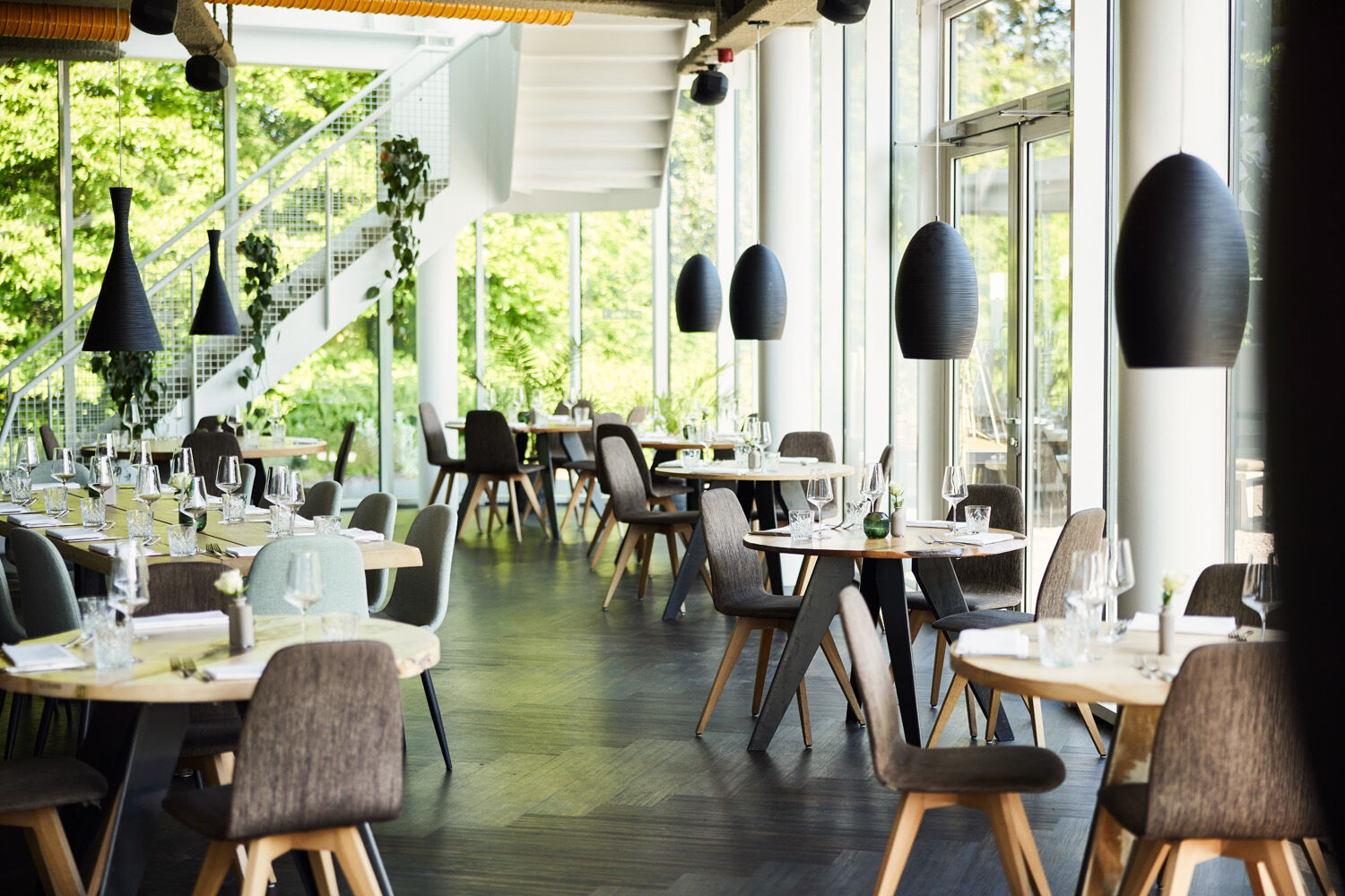 Het Paviljoen Sterrebos heeft een moderne eigentijdse inrichting, waar je omgeven wordt door de natuur. Deze groene omgeving is binnen in het Sterrebos doorgetrokken en u zult zich dan ook binnen te midden van het groen begeven. Het pand is omgeven door grote raampartijen, zodat u van elk tafeltje binnen of buiten kunt genieten van een prachtig uitzicht op de tuin.