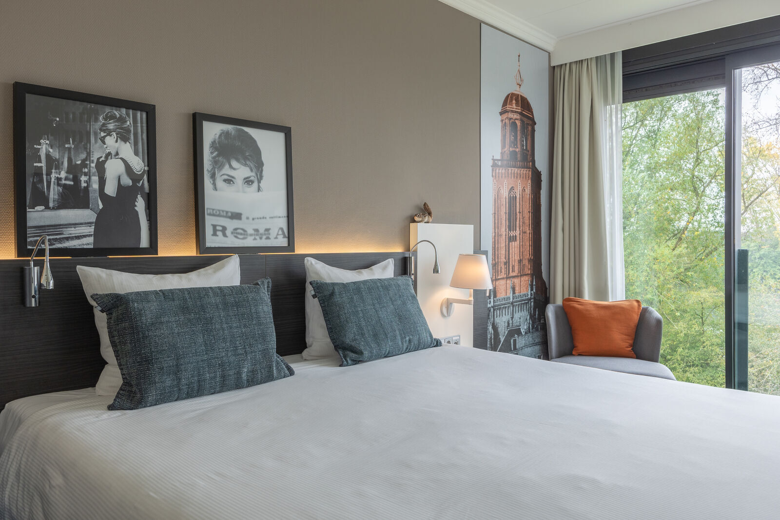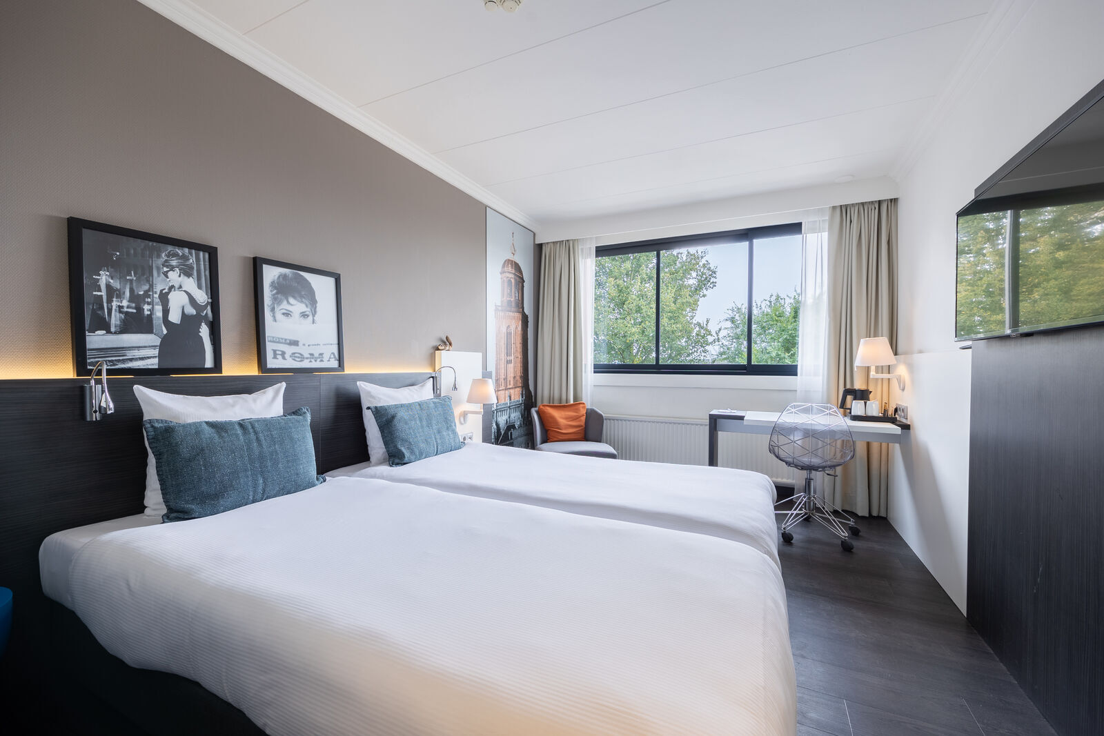 Alle kamers zijn rookvrij en voorzien van televisie en wifi. Douche en/of bad, wastafel en toilet in de badkamer. Er zijn kamers met een tweepersoonsbed of twee losse eenpersoonsbedden. Bij verblijf in het hotel kunt u een iPad lenen, fietsen huren en kosteloos parkeren.