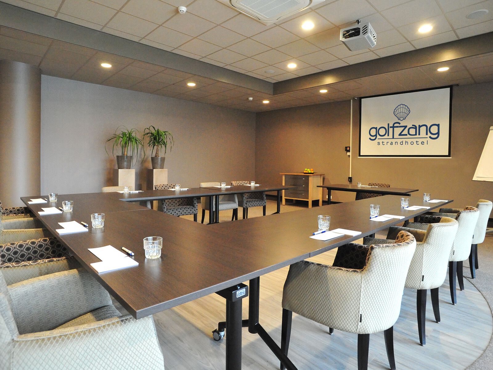 Vergaderen aan zee. Strandhotel Golfzang biedt diverse mogelijkheden voor vergaderingen en andere bijeenkomsten voor groepen tot 100 personen. De twee zalen in het hotel zijn te reserveren in diverse opstellingen, ook voor recepties en partijen.
