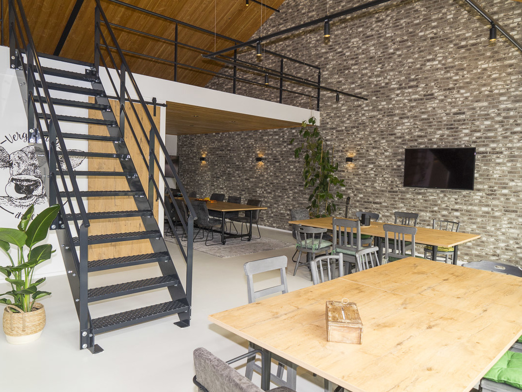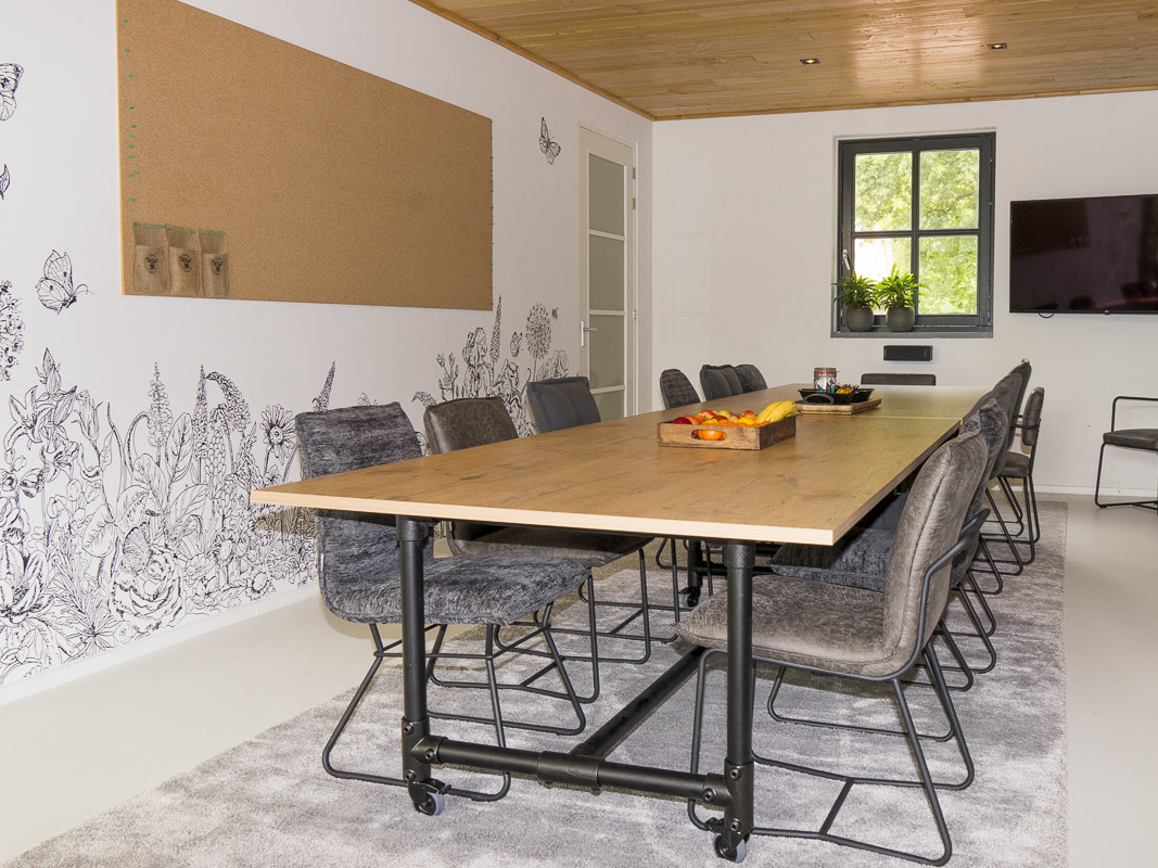 Grote tuindeuren, comfortabel meubilair, veel groen en natuurlijke materialen maken van Vergaderen in de wei een lichte, rustige en sfeervolle locatie. De tuindeuren geven toegang tot het terras op het zuiden, waar tussendoor een spelletje jeu-de-boules gespeeld kan worden. De ruimte wordt exclusief gehuurd, dus privacy is gegarandeerd. Alle denkbare faciliteiten, zoals tv-schermen, flipover en goede wifi, zijn aanwezig. Parkeren kan op het eigen parkeerterrein, waar ook twee laadpalen beschikbaar zijn.