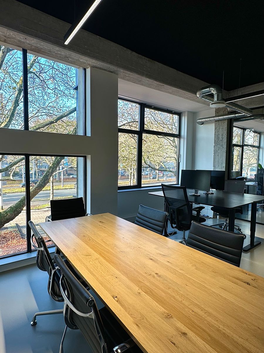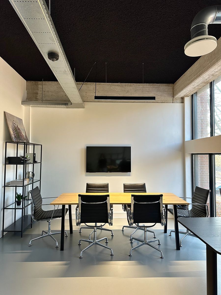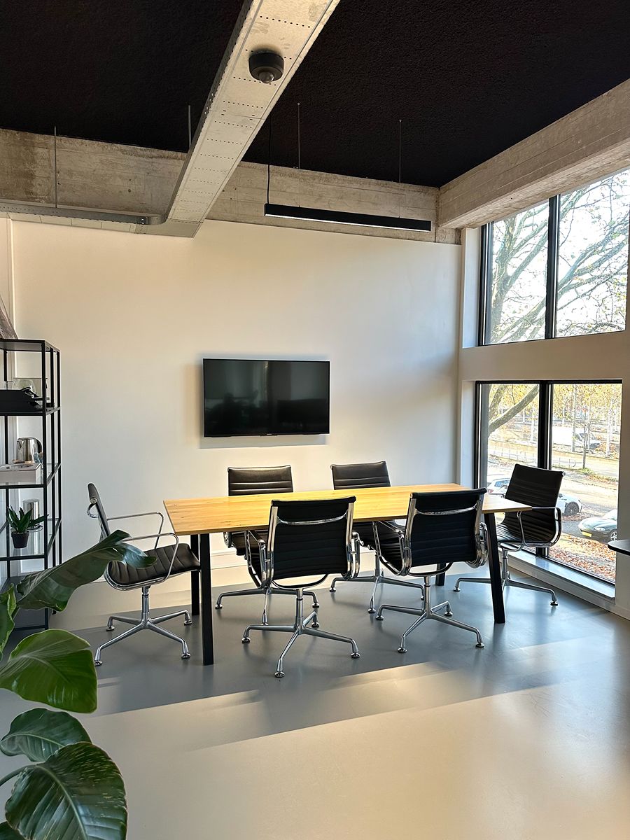 De sfeer in de vergaderruimte is rustig, licht en modern: precies wat je nodig hebt om productief te kunnen werken. De grote ramen zorgen voor veel natuurlijk daglicht, terwijl de strakke afwerking en zachte tinten een kalme, professionele uitstraling geven. De inrichting is bewust minimalistisch gehouden: geen ruis, geen drukte, alleen wat je nodig hebt om goed te kunnen werken of overleggen. De vergadertafel en stoelen zijn comfortabel en stijlvol, en de ruimte kan eenvoudig worden aangepast aan de gewenste setting: van een formele meeting tot een creatieve brainstorm. De zit/sta-bureaus met dubbele monitoren maken het mogelijk om moeiteloos te schakelen tussen vergaderen en geconcentreerd doorwerken. De akoestiek is zacht en prettig, waardoor gesprekken natuurlijk klinken en online meetings helder verlopen.