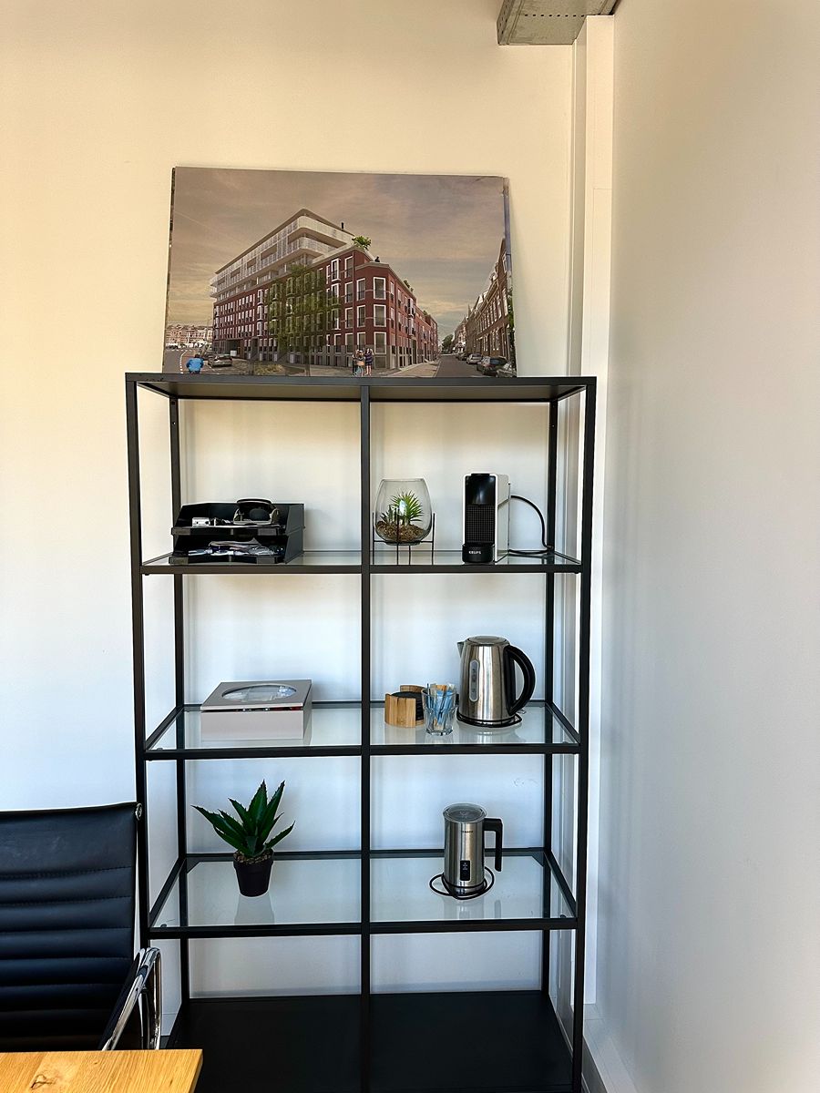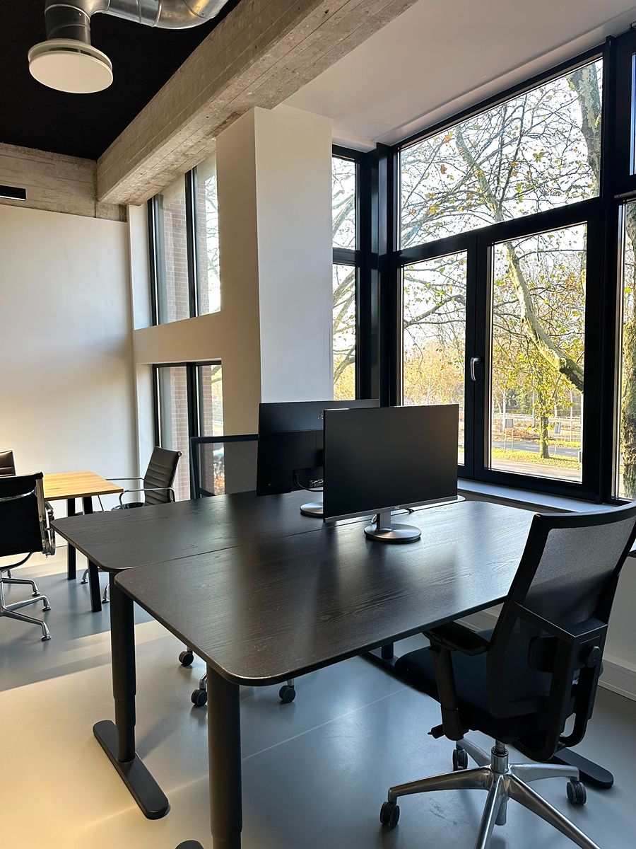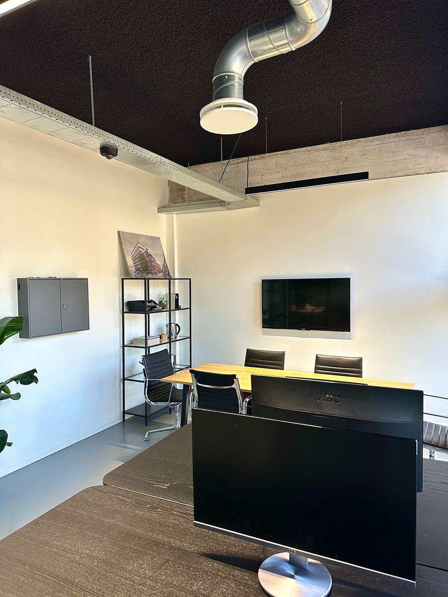 De sfeer in de vergaderruimte is rustig, licht en modern: precies wat je nodig hebt om productief te kunnen werken. De grote ramen zorgen voor veel natuurlijk daglicht, terwijl de strakke afwerking en zachte tinten een kalme, professionele uitstraling geven. De inrichting is bewust minimalistisch gehouden: geen ruis, geen drukte, alleen wat je nodig hebt om goed te kunnen werken of overleggen. De vergadertafel en stoelen zijn comfortabel en stijlvol, en de ruimte kan eenvoudig worden aangepast aan de gewenste setting: van een formele meeting tot een creatieve brainstorm. De zit/sta-bureaus met dubbele monitoren maken het mogelijk om moeiteloos te schakelen tussen vergaderen en geconcentreerd doorwerken. De akoestiek is zacht en prettig, waardoor gesprekken natuurlijk klinken en online meetings helder verlopen.