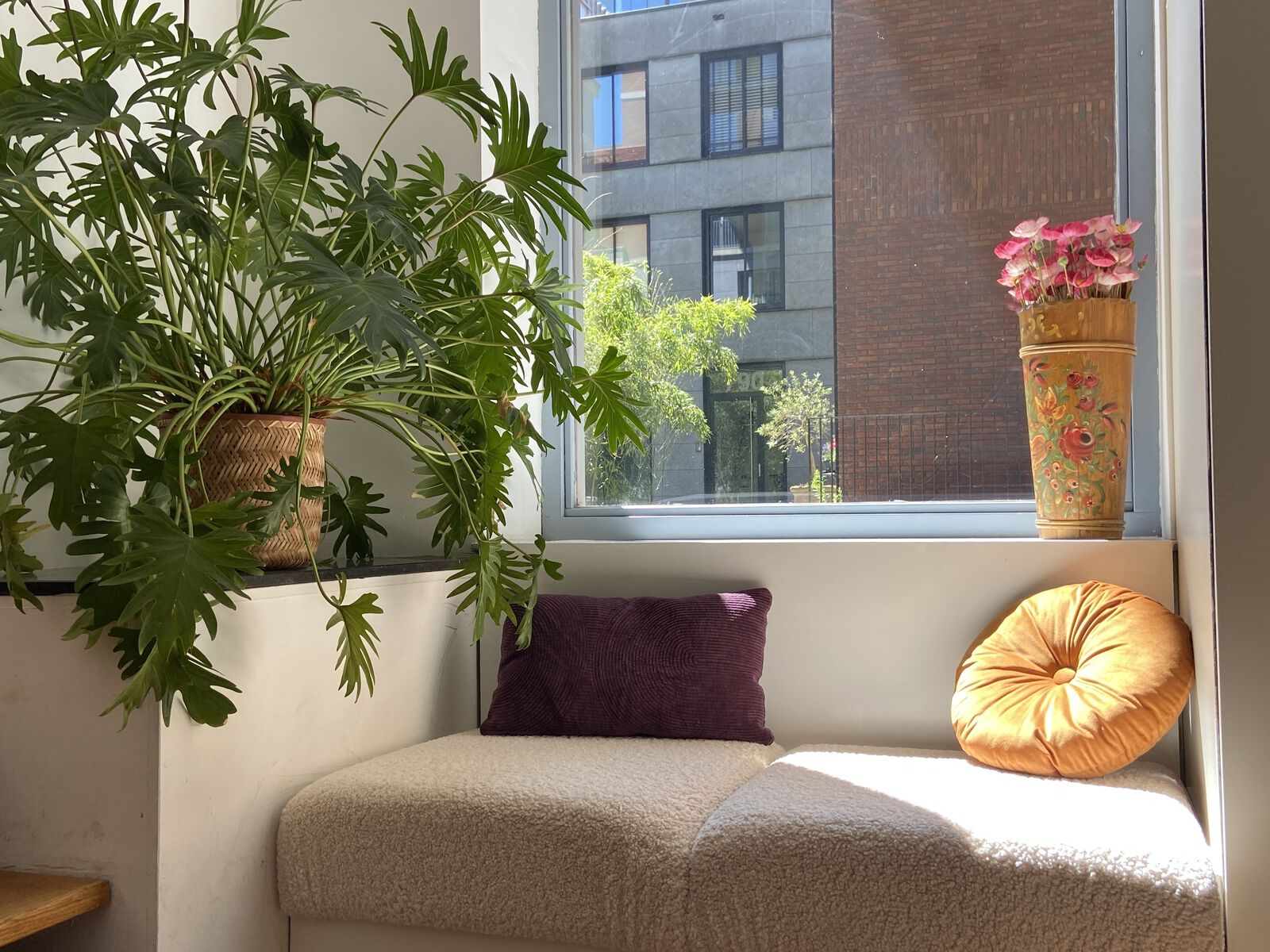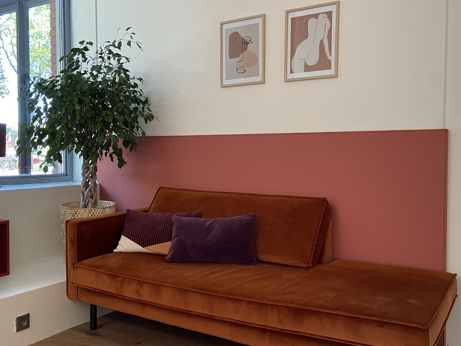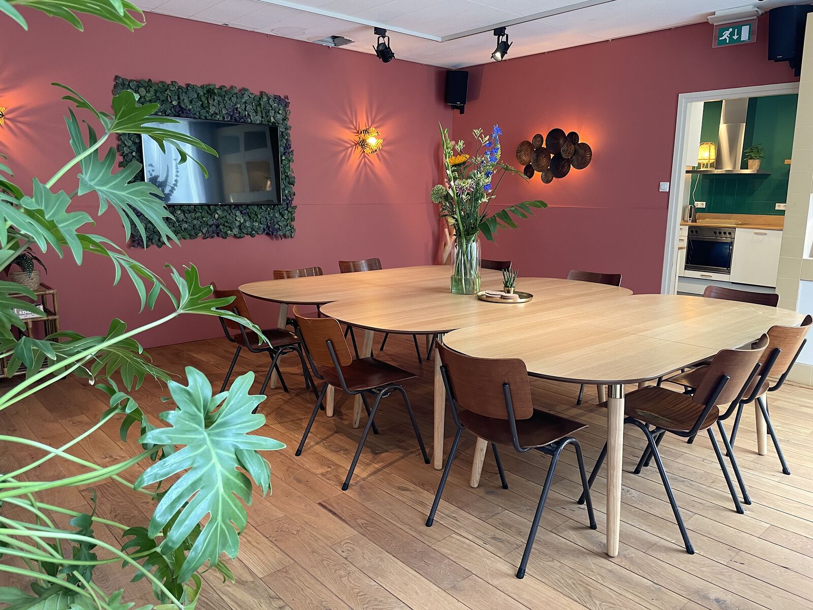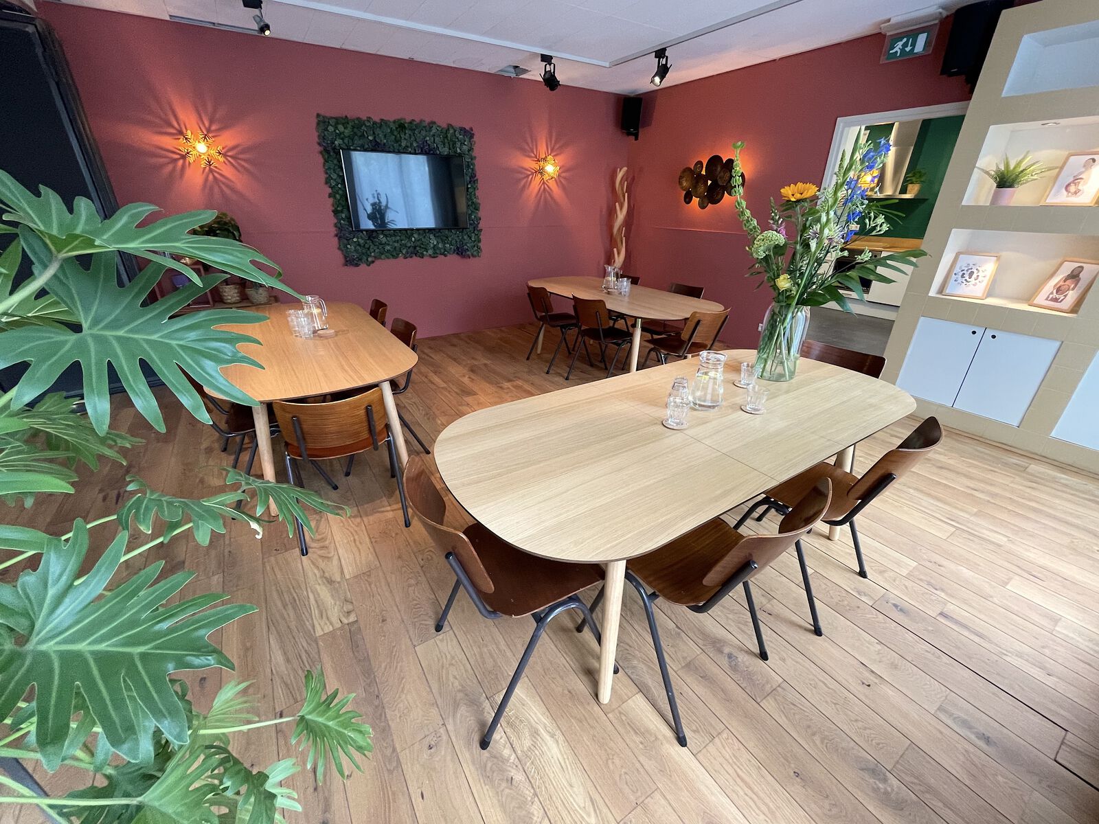 Rustige inrichting met houten vloer en veel planten. Er is een ruime hoeveelheid daglicht aanwezig.