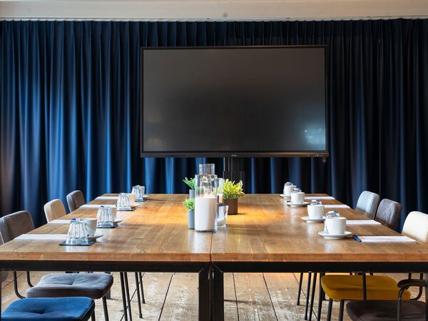 De Kraamkamer is in een boardroom-opstelling te gebruiken en inclusief een digitaal scherm, schrijfplanken met pennen, een flipover met stiften en gratis gebruik van wifi.
