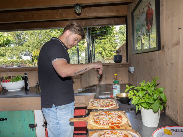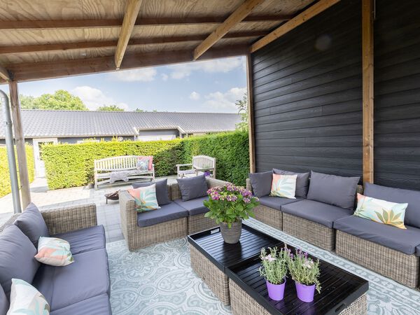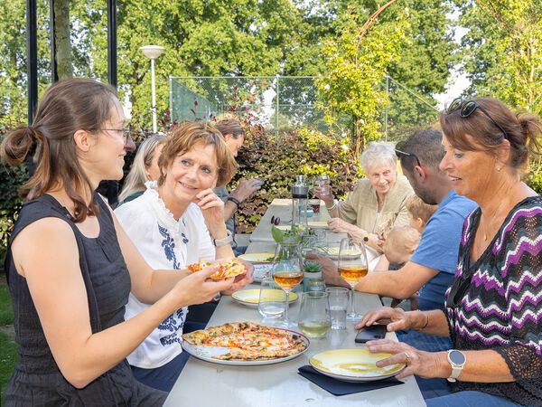 In de naastgelegen ruimte kan separaat worden geluncht. Dit is een heerlijke overkapping die, afhankelijk van de temperatuur, open of dicht gebruikt kan worden.