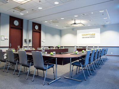 Meeting Room 3 is voorzien van een beamer, tv-scherm, gratis wifi, daglicht, ClickShare-systeem en Marriott's Meeting Service App. Het comfortabele 4-sterrenhotel Courtyard by Marriott Amsterdam Airport, met 260 hotelkamers en 10 vergaderzalen, ligt op loopafstand van Claus. Het is de perfecte uitvalsbasis voor een evenement vlakbij Schiphol.