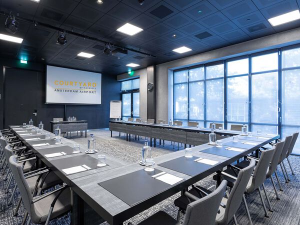 Meeting Room 5 is voorzien van een beamer, tv-scherm, gratis wifi, daglicht, ClickShare-systeem en Marriott's Meeting Service App. Deze ruimte kan gecombineerd worden met Meeting Room 4. De totale capaciteit bedraagt dan 100 personen. Het comfortabele 4-sterrenhotel Courtyard by Marriott Amsterdam Airport, met 260 hotelkamers en 10 vergaderzalen, ligt op loopafstand van Claus. Het is de perfecte uitvalsbasis voor een evenement vlakbij Schiphol.