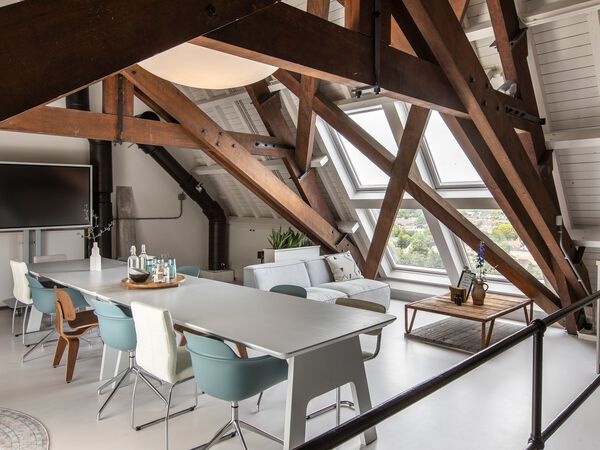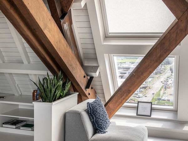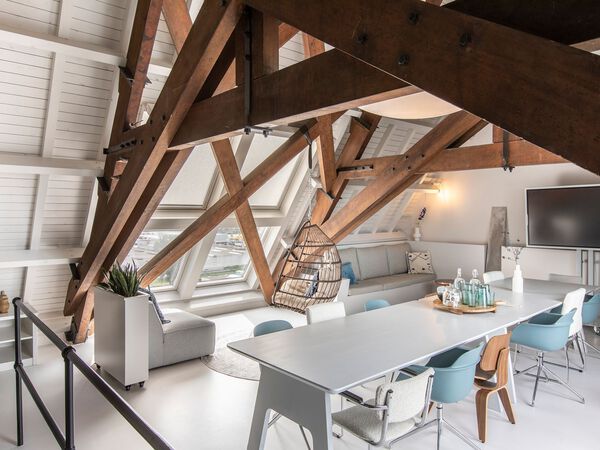 Huur je de Torenkamer? Dan heb je de drie bovenste verdiepingen van de watertoren exclusief tot je beschikking. Inclusief een eigen garderobe en een ruim toilet. Deze verdiepingen zijn semi open met elkaar verbonden. Vanuit de loft, misschien wel de mooiste verdieping van de watertoren, heb je vanaf zithoogte prachtig uitzicht door de grote dakramen aan beide kanten. Deze ruimte kun je gebruiken voor presentaties (inclusief modern multimedia scherm), vergaderingen of trainingen. In overleg zijn er diverse opstellingen mogelijk, passend bij jullie event. De entresol heeft een creatieve inrichting. Hier kun je brainstormen, plannen uitwerken of gebruik het voor een andere break-out doelstelling. In de woonkeuken starten jullie met koffie en thee en huisgemaakte lekkernijen. Hier wordt ook de lunch geserveerd en is het mogelijk om de dag af te sluiten met een borrel of diner.