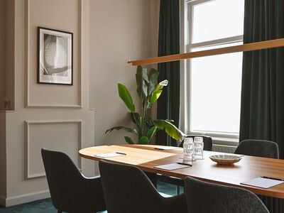 Op de tweede verdieping aan de grachtzijde bevindt zich deze boardroom met plaats voor circa 10 personen. De prachtige houten tafel en comfortabele kuipstoelen zijn ook voor langere bijeenkomsten zeer geschikt. Aan de muur hangt een groot ledscherm.