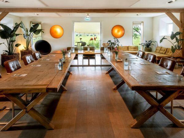Dit is de Large, geschikt voor een groter gezelschap. Deze ruimte is bijzonder geschikt voor grote groepen tot 35 personen. De sfeervol ingerichte ruimte, met tafels van 4 meter lang en aparte statafels voor tijdens een break, is van alle gemakken voorzien en er zijn diverse opstellingen mogelijk. In de aangrenzende keuken kan geluncht of gedineerd worden.