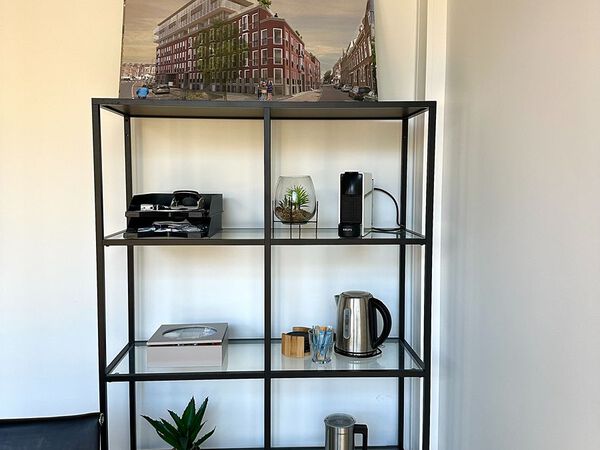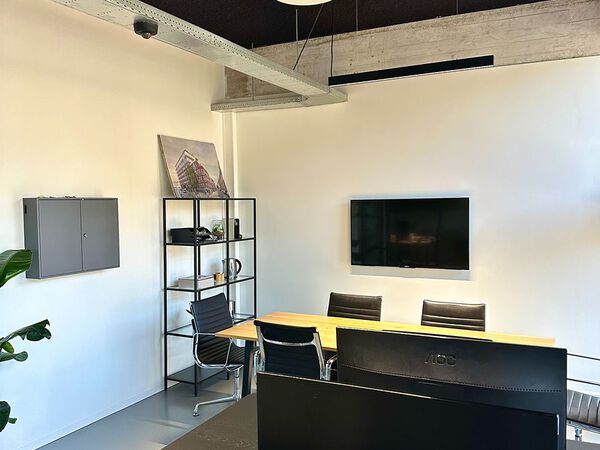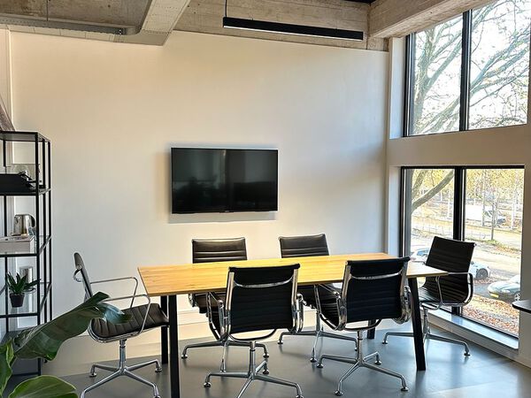 De vergaderruimte is licht, modern en volledig uitgerust voor zowel zakelijke meetings als creatieve sessies. Centraal staat een stijlvolle vergadertafel met 6 comfortabele stoelen, perfect voor kleine teams of klantafspraken. Voor presentaties en workshops is er een groot LD-scherm aanwezig. Daarnaast beschikt de zaal over 2 zit/sta-bureaus met dubbele monitoren, ideaal om na een meeting geconcentreerd door te werken.