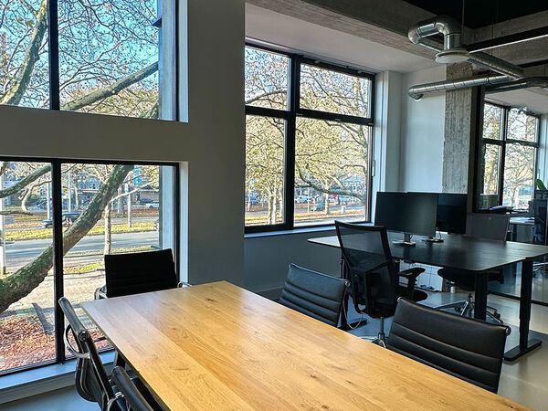 De sfeer in onze vergaderruimte is rustig, licht en modern: precies wat je nodig hebt om productief te kunnen werken. De grote ramen zorgen voor veel natuurlijk daglicht, terwijl de strakke afwerking en zachte tinten een kalme, professionele uitstraling geven. De inrichting is bewust minimalistisch gehouden: geen ruis, geen drukte, alleen wat je nodig hebt om goed te kunnen werken of overleggen. De vergadertafel en stoelen zijn comfortabel en stijlvol, en de ruimte kan eenvoudig worden aangepast aan de gewenste setting: van een formele meeting tot een creatieve brainstorm. De zit/sta-bureaus met dubbele monitoren maken het mogelijk om moeiteloos te schakelen tussen vergaderen en geconcentreerd doorwerken. De akoestiek is zacht en prettig, waardoor gesprekken natuurlijk klinken en online meetings helder verlopen.